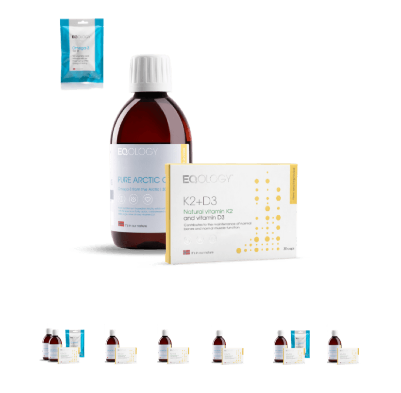 Es beinhaltet Pure Arctic Oil, ein hochwertiges norwegisches Omega-3-Vollspektrumprodukt aus nachhaltiger Herkunft, mit natürlich fermentiertem Vitamin K2 und Vitamin D3, sowie 2 Bluttest für Ihren Fettsäurespiegel.